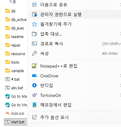 2. start.bat 선택하고 마우스 오른쪽 버튼을 클락합니다.