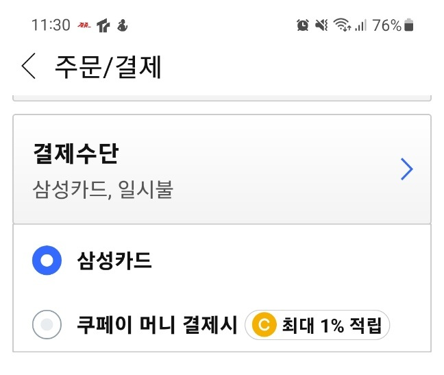 1. 주문/결제 단계에서 결제수단 선택합니다.
